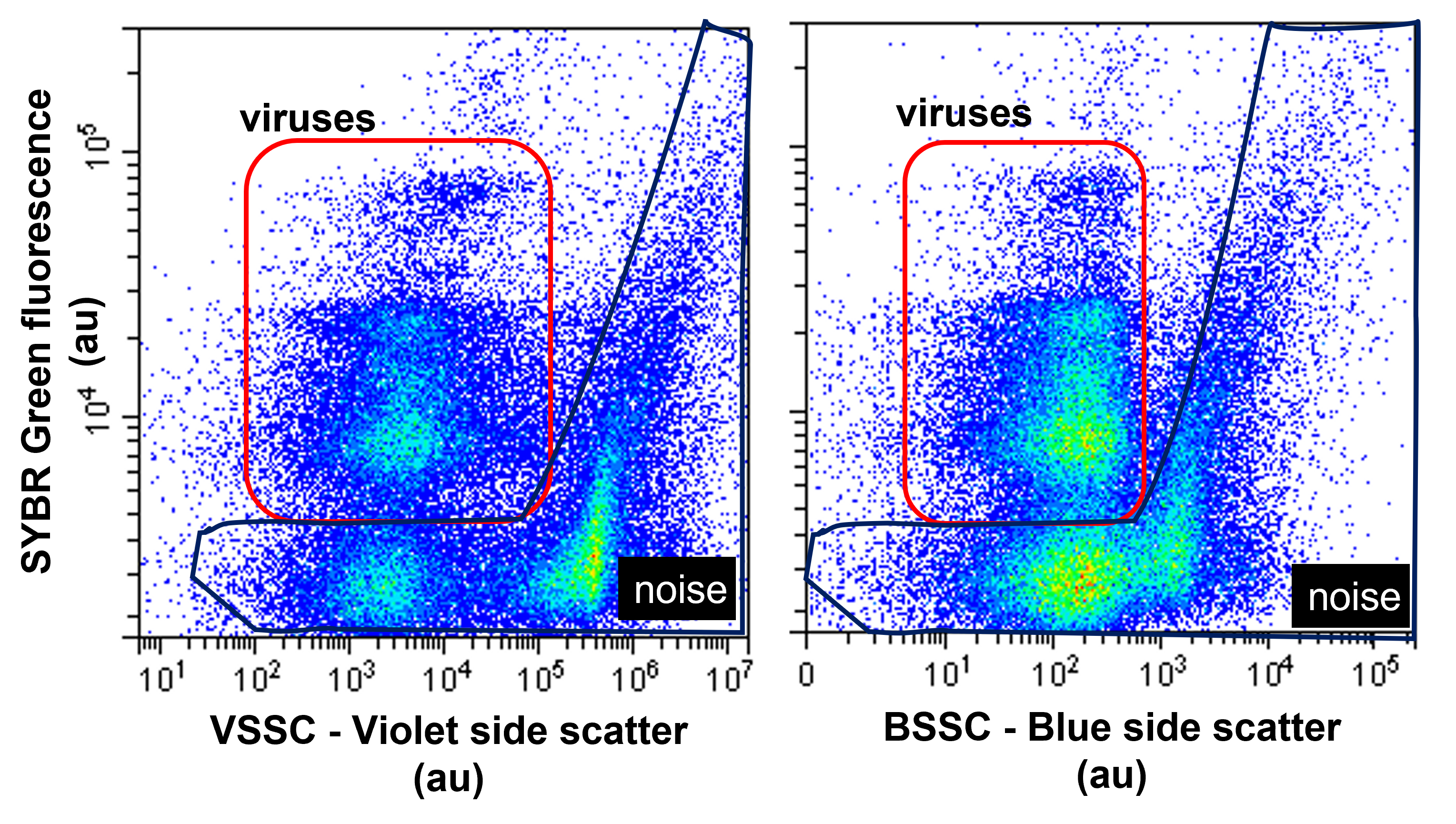 Comparaison de la diffusion à 90° violette (VSSC) et de la diffusion à 90° bleue (BSSC) pour deux échantillons marins côtiers. au : unités arbitraires. Les deux graphiques (cytogrammes) montrent la fluorescence induite par le SYBR Green (au) par rapport au VSSC ou au BSSC : les régions rouges montrent les différents sous-groupes de virus, les régions noire le bruit de fond de l’échantillon.